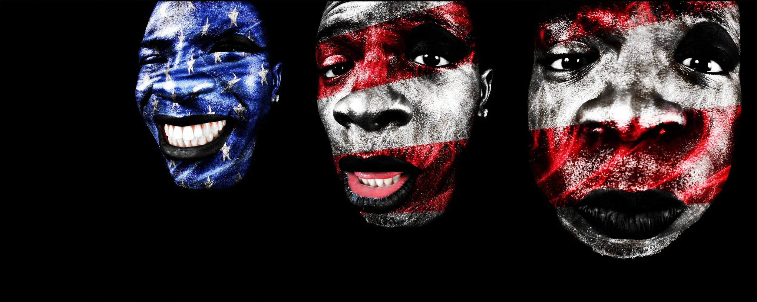 Golden Boyz was the first version — three faces in gold and black, raw and primal. Then came Obarama Boyz: the same faces painted with the American flag.